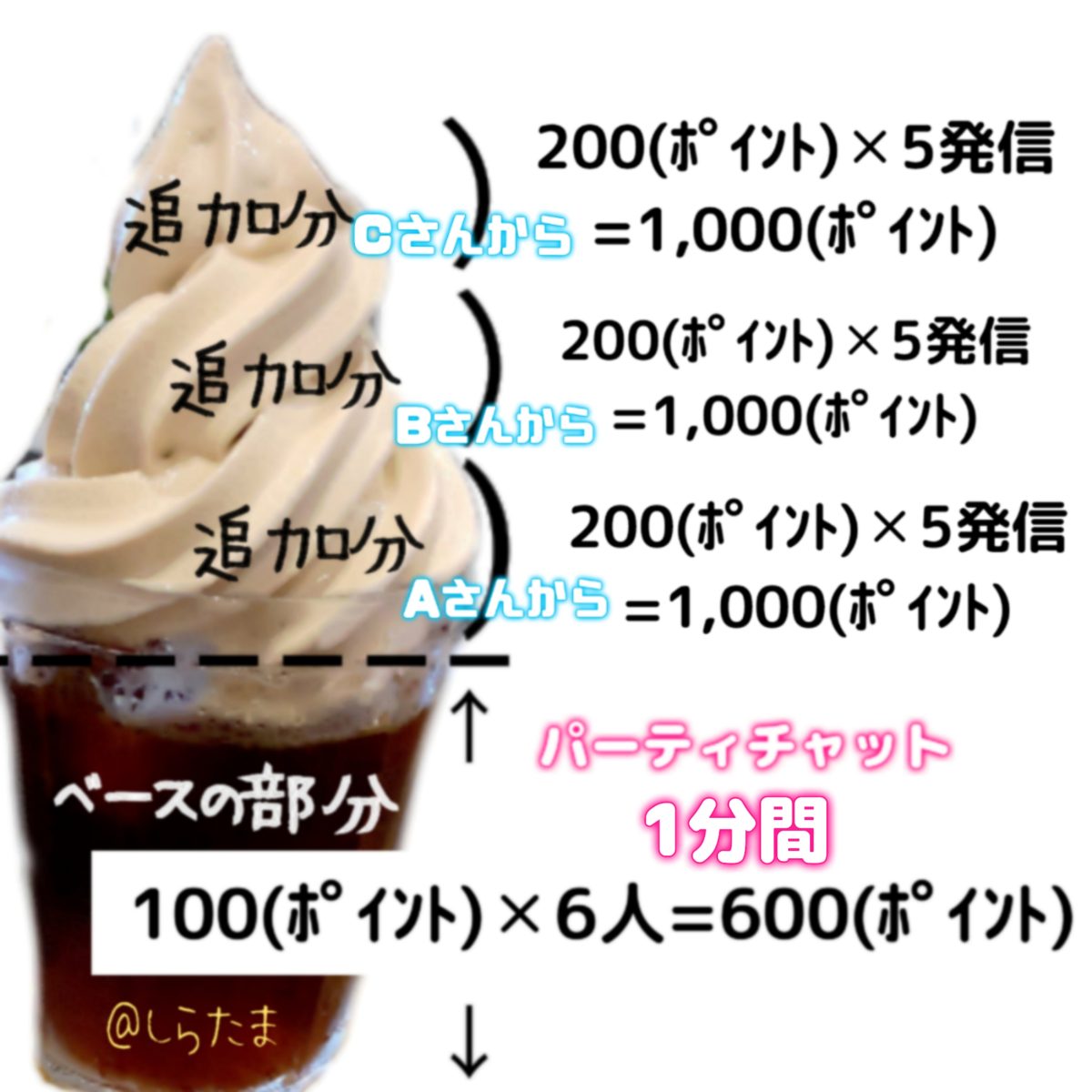 それを踏まえて、わたしが風船代1,000円を1分のチャット獲得した時はどのような状況だったかというのを、コーヒーフロートに表して説明していきますね😊