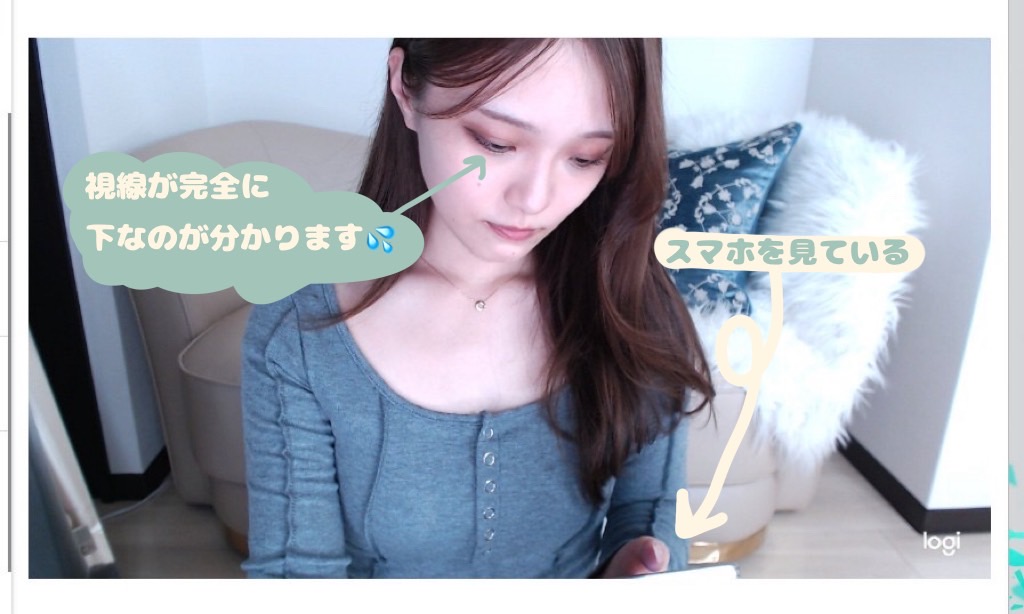 これはお客さまのお名前やコメントが出てくる画面とカメラの位置が違うために起こってしまうことなのですが、画面ばかり見ていると視線が落ちてしまいます(˘˘)