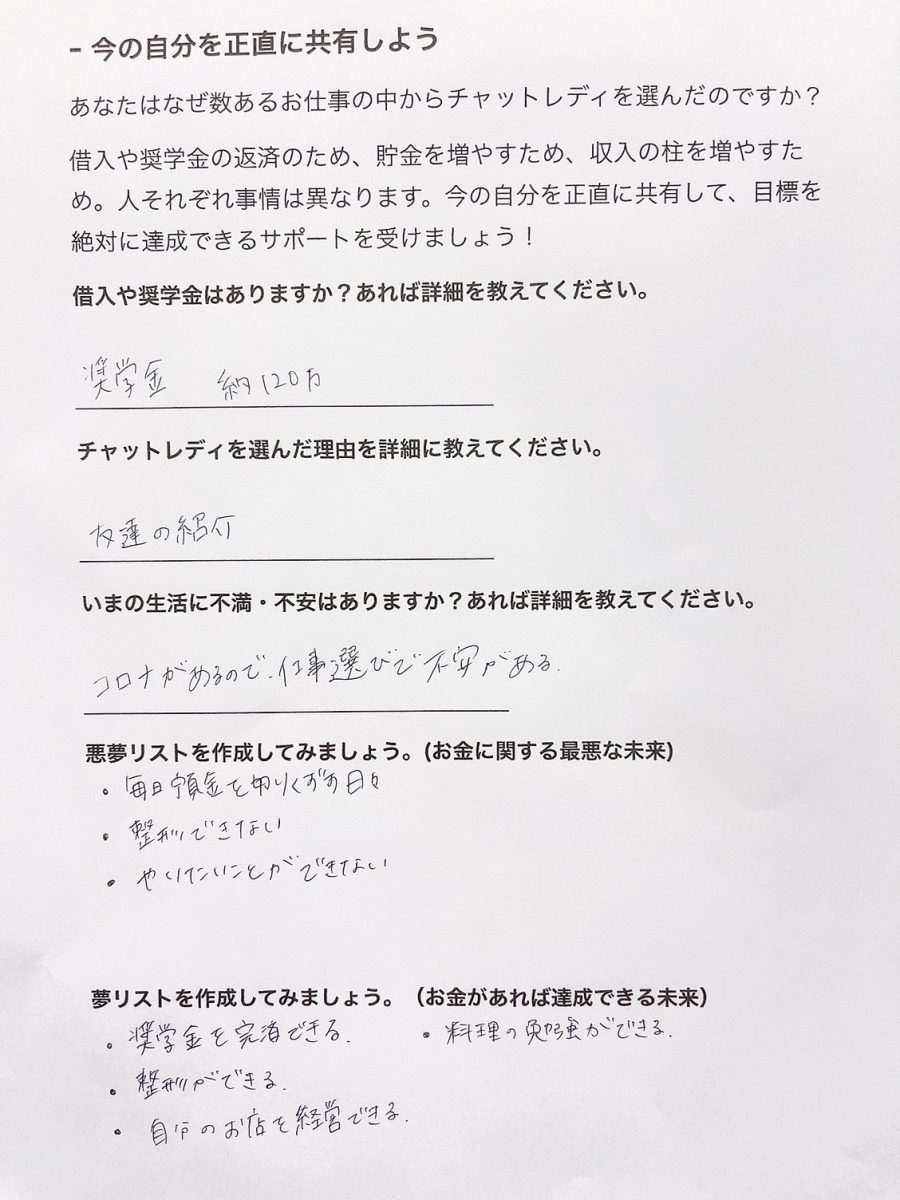Hさんは、友人の紹介で、コロナ禍でも直接人と合わお仕事できるのチャットレディに興味を持ち応募いただきました✨✨