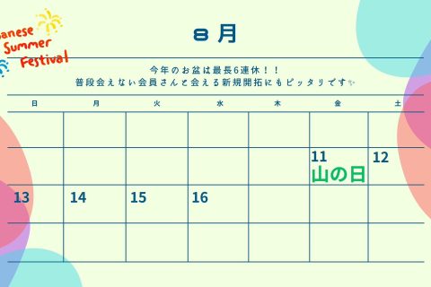特に今月のお盆は11日の金曜日が山の日で祝日の為、最長6連休になります。