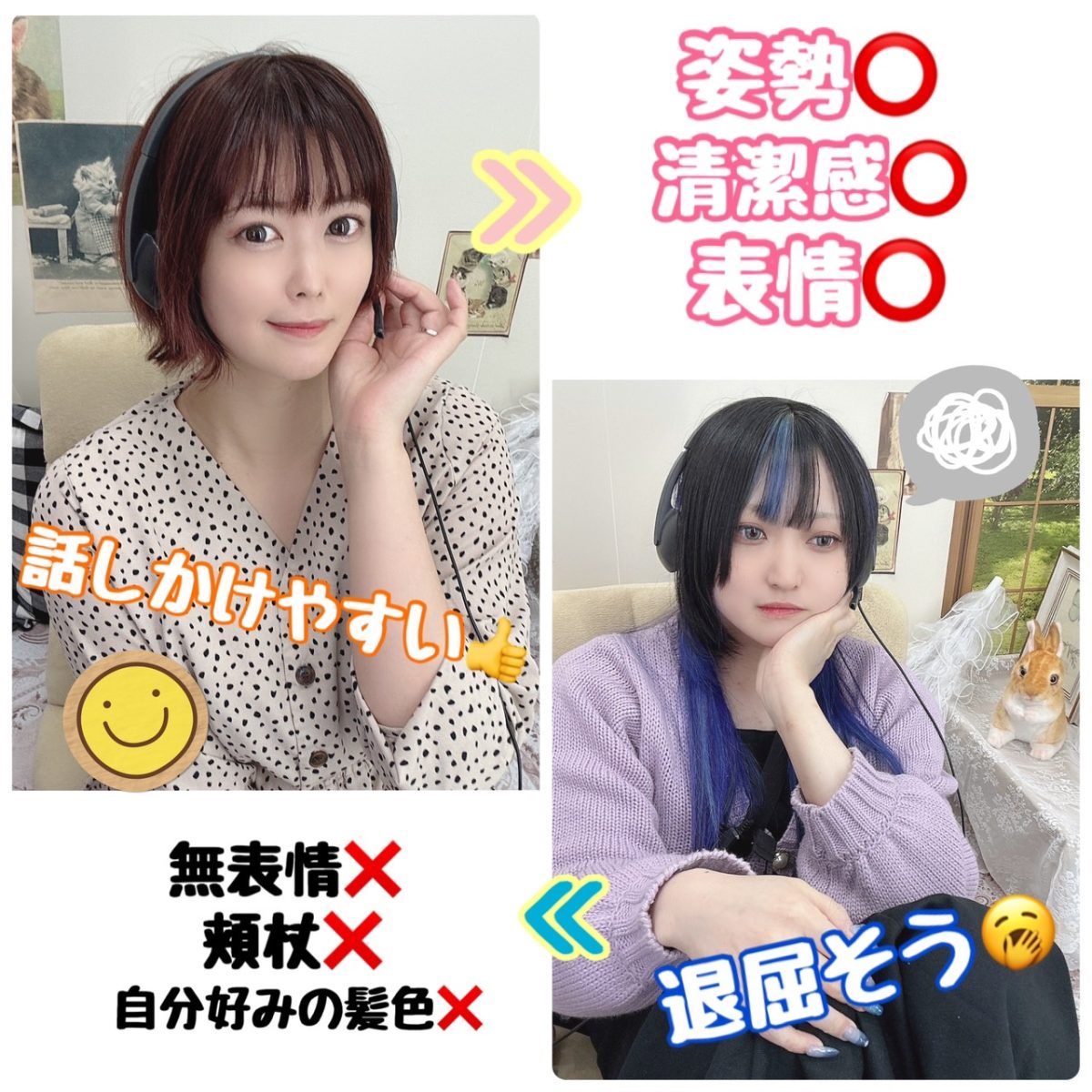 待機やチャットでは姿勢よくにこやかに。