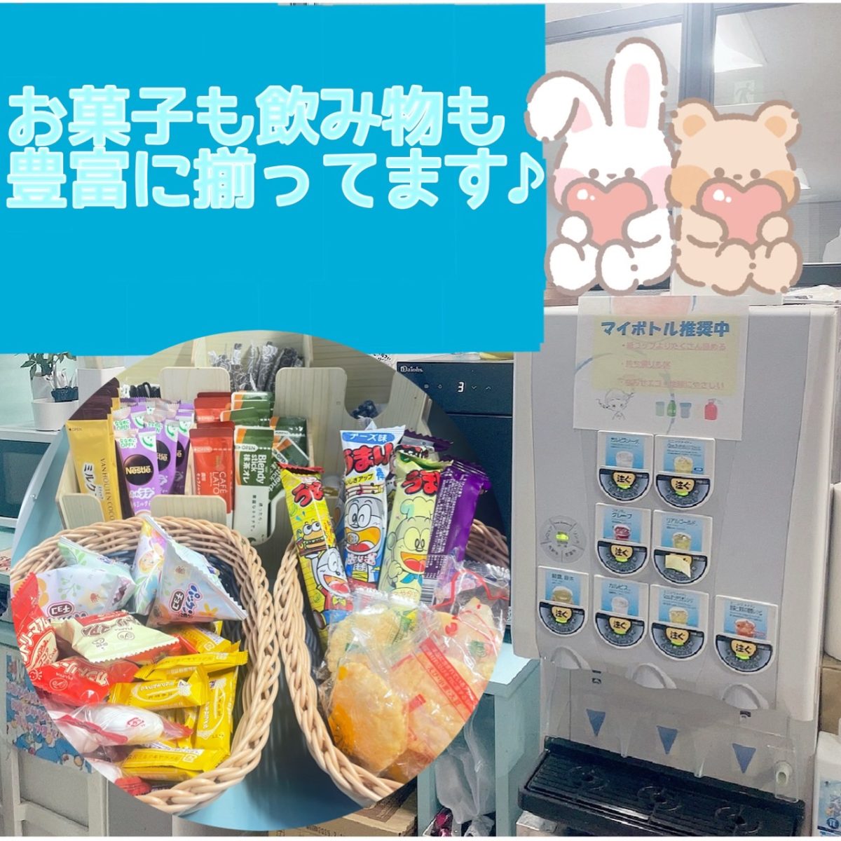 フリースペースには飲み物もお菓子も豊富にありますので
