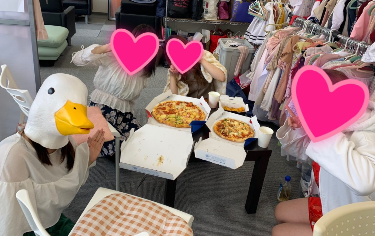 ↓みんなでピザを食べる図。