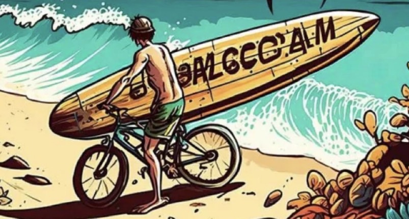 自転車に乗りながらサーフボード持つんです(°_°)!